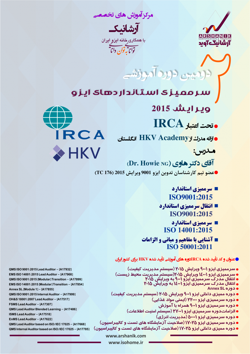 این دوره آموزشی با مشخصات ثبت شده به صورت زیر در سایت IRCA برای کشور ایران از طرف HKV Academy کشور انگلستان تأیید شده است. و مدرک بین المللی صادر شده تحت اعتبار IRCA و HKV Academy انگلستان می باشد.